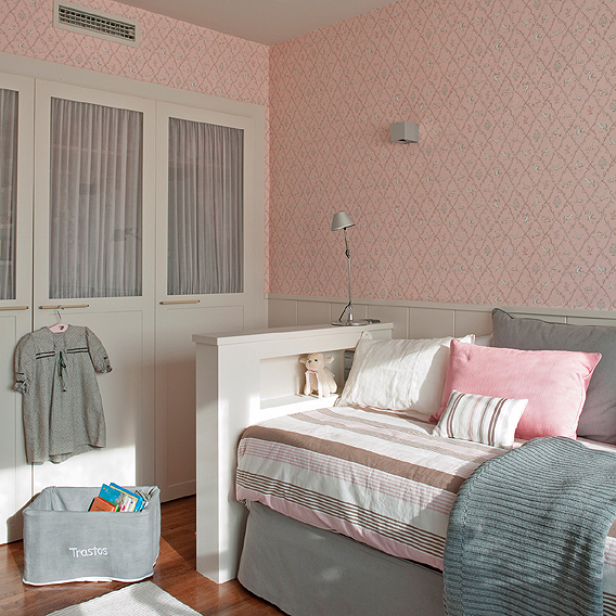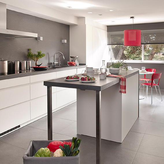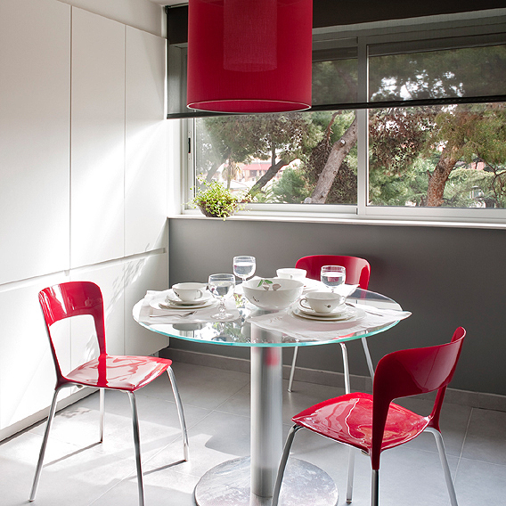 En la cocina utilizamos el rojo como elemento motivador frente al blanco del mobiliario y al gris de paredes y suelos.