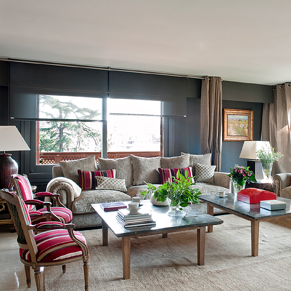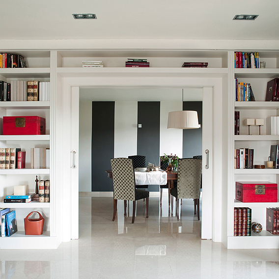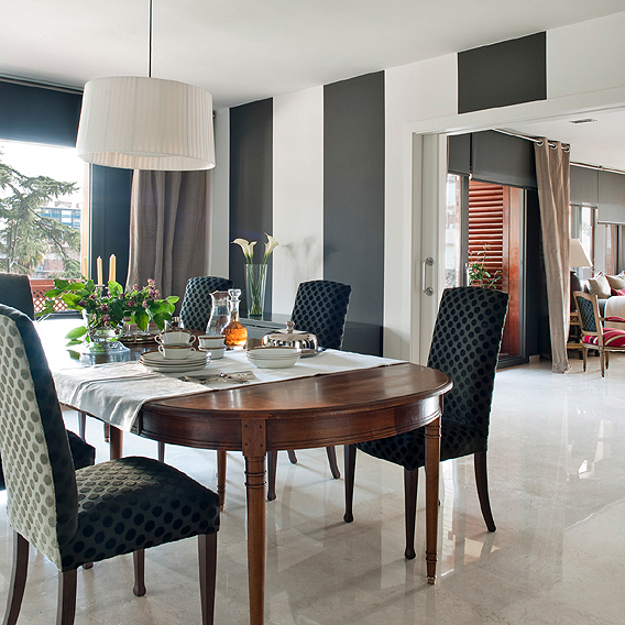 El mármol del suelo en la zona noble fue conservado. Utilizamos tonalidades en gris oscuro para las paredes del salón, y pintamos rayas de dos colores, en el comedor, para crear un continente más actual.